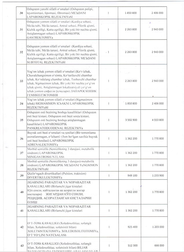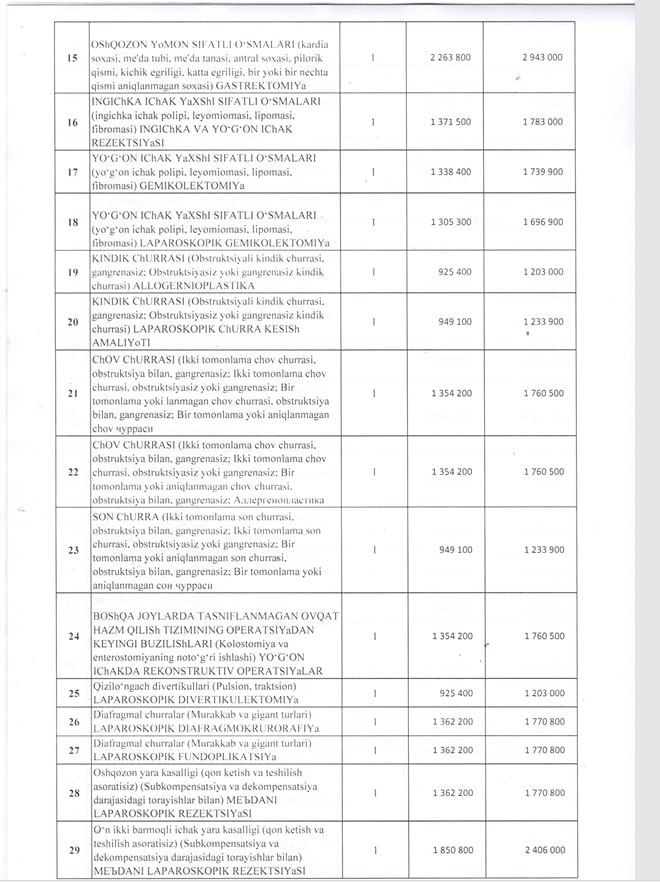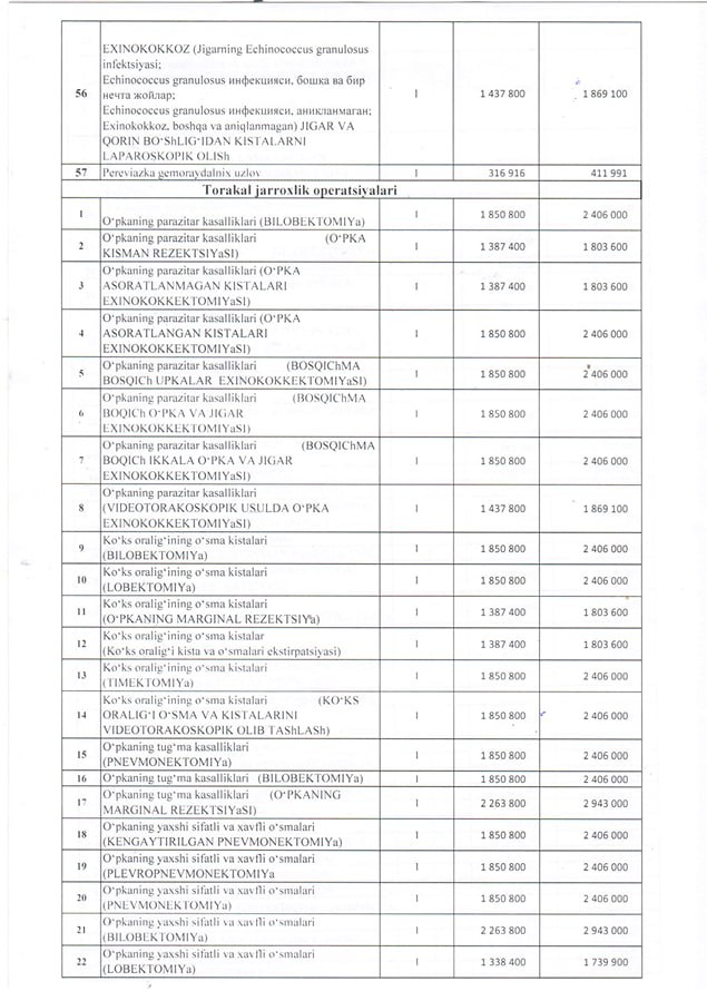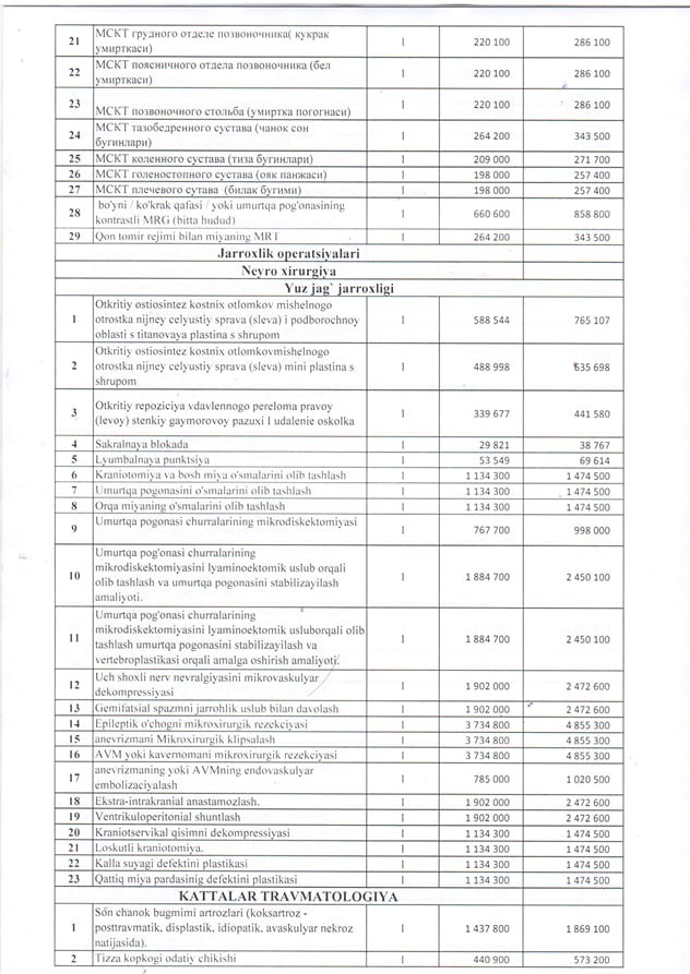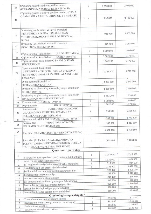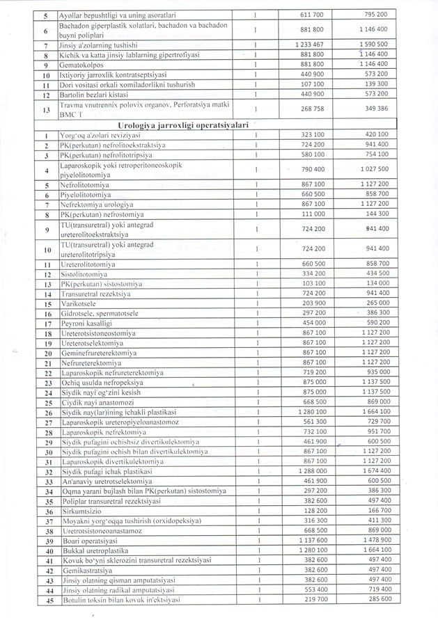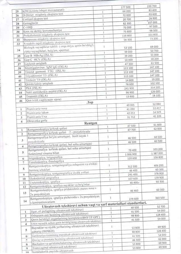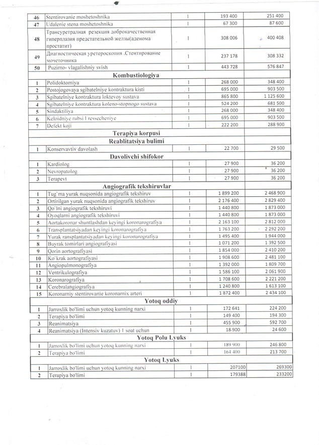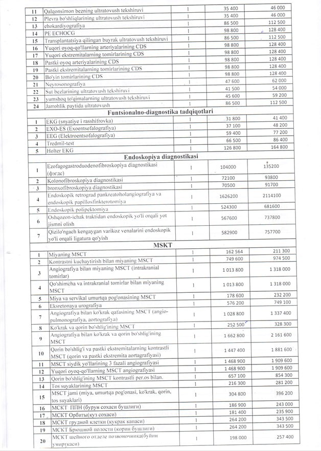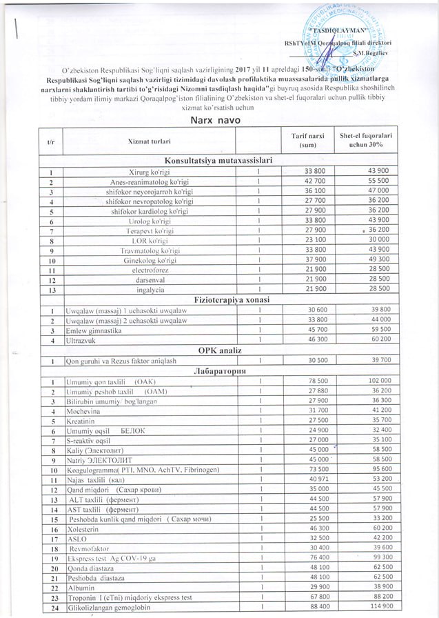 O‘zbekiston Respublikasi Sog’liqni saqlash vazirligining 2017 yil 11 apreldagi 150-sonli “O‘zbekiston Respublikasi Sog’liqni saqlash vazirligi tizimidagi davolash profilaktika muasasalarida pullik xizmatlarga narxlarni shakllantirish tartibi to‘g’risidagi nizomni tasdiqlash haqida”gi buyruqlari asosida Respublika shoshilinch tibbiy yordam ilmiy markazi Korakalpokston filialining uzbekiston va chet-el fukarolari uchun pullik tibbiy xizmat korsatish uchun